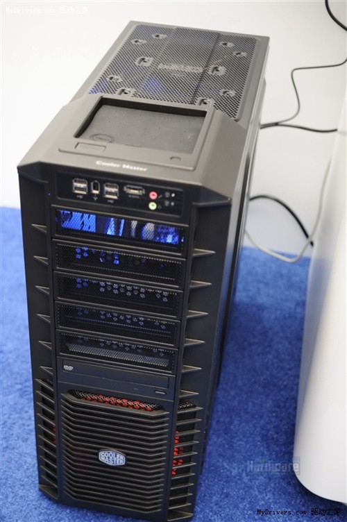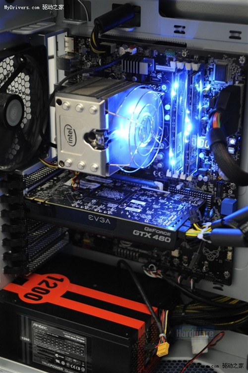 Intel不允许观众自由操作这套演示系统,所以没办法亲自体验Sandy Bridge如何超频。从外部观察,酷冷的机箱里安放的还有:Intel LGA1155原厂主板(P67?)、EVGA GeForce GTX 460显卡、Crucial Ballistix Tracer DDR3内存、安钛克1200W电源。