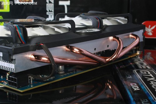 散热部分是这款GTS450冰龙版的特色所在。GTS450冰龙版采用的是倍受玩家喜爱的Twin Turbo增强版散热器,其配备了双风扇以及四热管的豪华设计,可以对GTS450进行强效散热。四根热管采用穿FIN工艺直接与GPU核心接触,两个90MM直径的大滚珠风扇在保持强大风力之余,噪音控制也非常出色;此外,铝片还采用直插工艺,大大增强了热接触面积,令散热效果更加出众。根据测试,这款GTS450冰龙在满载状态下,温度亦仅仅为50度!