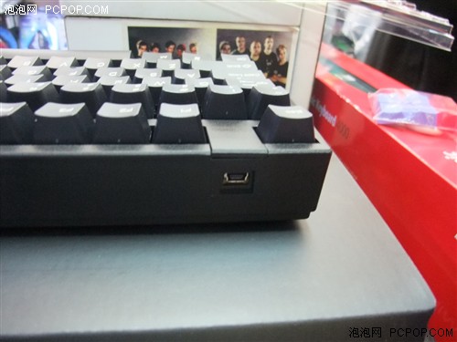 Ducky DK1087机械键盘采用连线分离式设计,连线的接口被设置在了机身左前方。接口上方设置了一个小缺口,拆卸上盖时只要从这里向上一揭就可以了。在USB接口下,这款键盘可以实现6键无冲突,而转接PS/2接口后,可以实现全键无冲突。