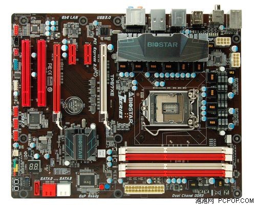 映泰TP67XE主板全貌图,通过上图我们可以正面看到这块主板除了基于最新的英特尔P67芯片组外,主板采用ATX全尺寸大板设计,全固态电容,十相供电和双八针辅助供电接口,两条PCI-E 2.0 x16插槽,应该可以支持双路SLI和CrossFireX,PCI-E 2.0 x1、PCI插槽也各有两条,存储接口有两个SATA 6Gbps(白色)、三个SATA 3Gbps(红色),集成千兆以太网卡和7.1声道声卡。板载接口上,我们可以看到一个5Pin的CIR红外扩展接口,延续映泰对高清遥控的支持。