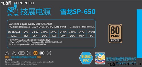 另一款通过铜牌认证的雪龙SP-650拥有更高的输出功率,更加适合中高端平台使用,在20%以及100%负载下这款电源的转换效率已经接近了银牌标准。