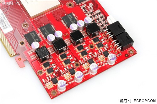 供电方面,耕昇GTX460关羽版采用了3+1相供电设计,核心3相,显存单相。而用料方面,我们可以看到该卡不但全部采用了全封闭电感以及三洋SPEC高品质固态电容,而且还采用了成本高昂的安森美超薄型SO-8 FL封闭4921N MOSFET。