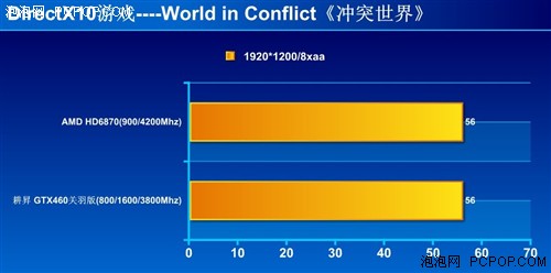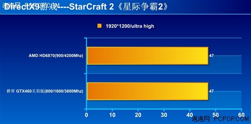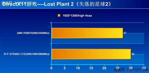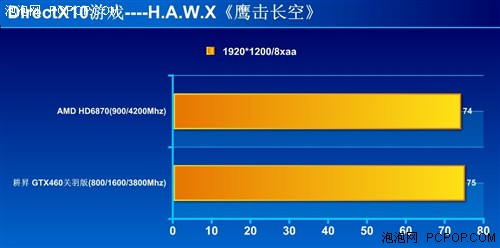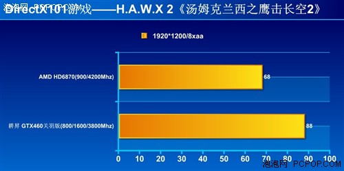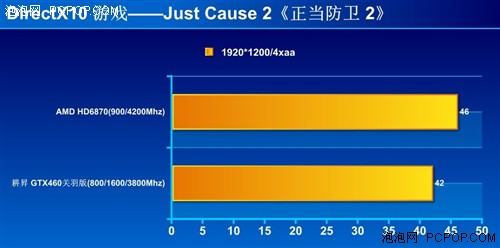 首先,本次测试中新加入了两款游戏:鹰击长空2,正当防卫2,其中鹰击长空2是采用了大量Tessellation的新款DX11游戏,所以对于GTX460来说,有着很明显的性能优势。为了公平性,本次测试也去掉了Physx测试项目来模拟用户的实际应用。从性能上来看,高频版的耕昇 GTX460关羽则超越了公版HD6870约1.5%。