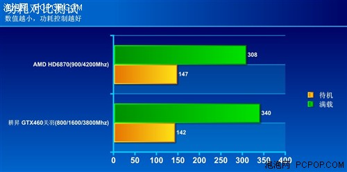 从功耗对比测试中可以看出,HD6800在功耗控制方面仍然有着很在的优势,尤其是单6Pin设计的HD6850.而高频版的GTX460在满载方面则比HD6870要高出32W。