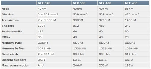 在功耗方面,由于采用完整版GF110的GTX580功耗已经达到了244W,如果GTX590完全照搬GTX580核心参数的话,功耗将接近500W。因此NVIDIA很有可能在GTX590的频率以及功耗方面进行一些优化。但具体细节我们还不得而知。