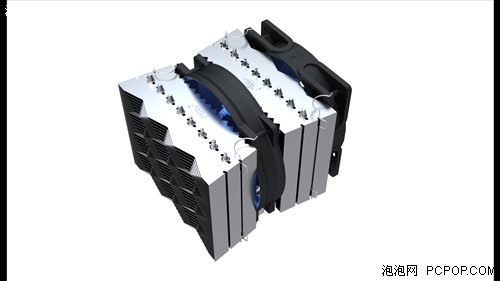 他们首推的双塔“三明治”结构高端散热器能为240W处理器提供散热解决方案,上图中中间一颗是14cm风扇靠外的是12cm,均采用他们独有的I.D.D减震技术打造,通过图片可以看出这款散热器支持最多三颗风扇,有八根热管。