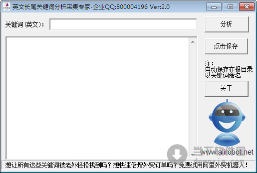软件名称:英文长尾关键词分析采集专家 2.0 绿色免费版 软件大小:297KB 软件语言:简体中文 软件类别:国产软件/免费软件/浏览辅助 运行环境:Win2003, WinXP, Win2000, Vista, Win7 软件简介: 英文长尾关键词分析采集专家是一款永久免费,用于快速分析采集英文长尾关键词的小软件,使用简单方便。特别适合企业使用. 英文长尾关键词分析采集专家 2.0 绿色免费版 下载 英文长尾关键词分析采集专家 2.0 绿色免费版 迅雷下载 下载页面:http://www.downxia.com/downinfo/22630.html