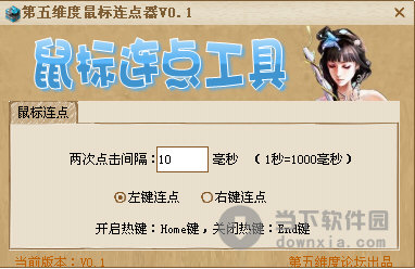 软件名称:鼠标连点工具|第五维度鼠标连点器 0.1 绿色版 软件大小:1537KB 软件语言:简体中文 软件类别:国产软件/免费软件/键盘鼠标 运行环境:Win2003, WinXP, Win2000, Vista, Win7 软件简介: 第五维度鼠标连点器可以自由设置单击鼠标间隔时间(最短间隔为毫秒)及单击方式(左键、右键),只需要将鼠标移动到需要连点的地方,然后按HOME热键就可以启动连点了 鼠标连点工具|第五维度鼠标连点器 0.1 绿色版 下载 鼠标连点工具|第五维度鼠标连点器 0.1 绿色版 迅雷下载 下载页面:http://www.downxia.com/downinfo/23985.html