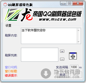软件名称:万能刷屏器|qq刷屏器 V1.0 绿色版 软件大小:143KB 软件语言:简体中文 软件类别:国产软件/免费软件/QQ 专区 运行环境:Win2003, WinXP, Win2000, Vista, Win7 软件简介: qq刷屏器是一款非常好用的可以无限制给好友发送信息的万能刷屏器。这款软件绿色无需安装,只要打开就能使用。只要在刷屏内容中输入你想要说的话然后选择你的列表再点击发送 万能刷屏器|qq刷屏器 V1.0 绿色版 下载 万能刷屏器|qq刷屏器 V1.0 绿色版 迅雷下载 下载页面:http://www.downxia.com/downinfo/24718.html