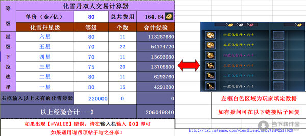 软件名称:天下3化雪丹计算器|天下3双人交易化雪计算器 免费版 软件大小:232KB 软件语言:简体中文 软件类别:游戏视频/免费软件/游戏工具 运行环境:Win2003, WinXP, Win2000, Vista, Win7 软件简介: 天下3双人交易化雪计算器是一款简单的excel模式的天下3化雪丹计算器,界面十分清楚,只要你输入化雪丹的星级、等级和交易个数,该化雪丹计算器就会帮你计算出合计的经验 天下3化雪丹计算器|天下3双人交易化雪计算器 免费版 下载 天下3化雪丹计算器|天下3双人交易化雪计算器 免费版 迅雷下载 下载页面:http://www.downxia.com/downinfo/24722.html