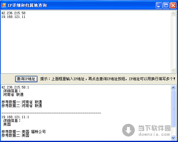 软件名称:详细ip地址查询软件|IP详细和归属地查询 V1.0 绿色免费版 软件大小:19KB 软件语言:简体中文 软件类别:国产软件/免费软件/IP 工具 运行环境:Win2003, WinXP, Win2000, Vista, Win7 软件简介: IP详细和归属地查询是一款详细ip地址查询软件,这款IP地址查询软件非常小巧,而且绿色无毒,下载打开之后只要你输入正确的IP 详细ip地址查询软件|IP详细和归属地查询 V1.0 绿色免费版 下载 详细ip地址查询软件|IP详细和归属地查询 V1.0 绿色免费版 迅雷下载 下载页面:http://www.downxia.com/downinfo/25658.html
