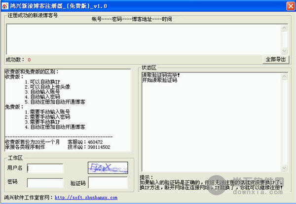 软件名称:新浪博客注册器|鸿兴新浪博客注册器 V1.0 绿色免费版 软件大小:328KB 软件语言:简体中文 软件类别:国产软件/免费软件/杂类工具 运行环境:Win2003, WinXP, Win2000, Vista, Win7 软件简介: 鸿兴新浪博客注册器是一款可以帮助用户快速注册新浪博客账号的工具,用户只需在该新浪博客注册器中输入用户名、密 码以及验证码,软件就会自动帮用户注册博客,并自动开通博客 新浪博客注册器|鸿兴新浪博客注册器 V1.0 绿色免费版 下载 新浪博客注册器|鸿兴新浪博客注册器 V1.0 绿色免费版 迅雷下载 下载页面:http://www.downxia.com/downinfo/26591.html