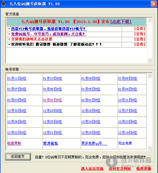 软件名称:qq靓号获取器|七八位qq靓号获取器 V1.9 官方免费版 软件大小:68KB 软件语言:简体中文 软件类别:国产软件/免费软件/QQ 专区 运行环境:Win2003, WinXP, Win2000, Vista, Win7 软件简介: 七八位qq靓号获取器是一款可以帮助用户获取6、7、8位QQ靓号的工具,获取的QQ号以及密 码一键复制,软件保证每日手动更新,所有QQ号保证都是最新的。 qq靓号获取器|七八位qq靓号获取器 V1.9 官方免费版 下载 qq靓号获取器|七八位qq靓号获取器 V1.9 官方免费版 迅雷下载 下载页面:http://www.downxia.com/downinfo/30854.html