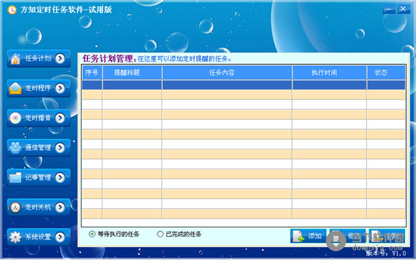 软件名称:windows定时任务软件|方知定时任务软件 V1.0 绿色免费版 软件大小:2325KB 软件语言:简体中文 软件类别:国产软件/免费软件/开关定时 运行环境:Win2003, WinXP, Win2000, Vista, Win7 软件简介: 方知定时任务软件是一款操作简单。功能齐全的桌面定时工具。该windows定时任务软件可以创建各种定时任务同时还有记事管理和通信管理,让你不会错过重要的工作和事情。 windows定时任务软件|方知定时任务软件 V1.0 绿色免费版 下载 windows定时任务软件|方知定时任务软件 V1.0 绿色免费版 迅雷下载 下载页面:http://www.downxia.com/downinfo/30883.html