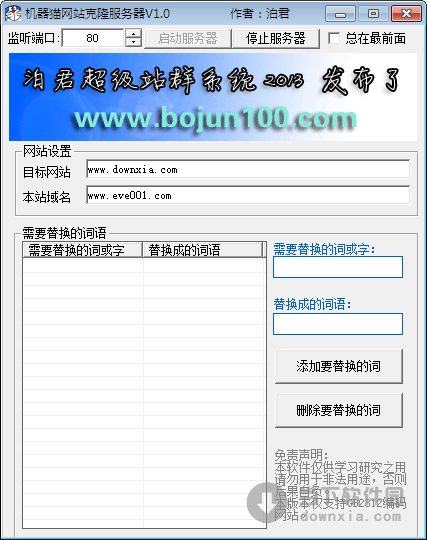 软件名称:网站克隆软件|机器猫网站克隆服务器 1.0 绿色免费版 软件大小:786KB 软件语言:简体中文 软件类别:国产软件/免费软件/服务器区 运行环境:Win2003, WinXP, Win2000, Vista, Win7 软件简介: 机器猫网站克隆服务器让你轻松拥有大量的网站!内嵌seo优化,蛛蛛劫持等功能。 网站克隆软件|机器猫网站克隆服务器 1.0 绿色免费版 下载 网站克隆软件|机器猫网站克隆服务器 1.0 绿色免费版 迅雷下载 下载页面:http://www.downxia.com/downinfo/30884.html