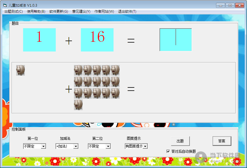 软件名称:20以内加减法游戏|儿童加减法 1.0.3 绿色免费版 软件大小:683KB 软件语言:简体中文 软件类别:国产软件/免费软件/学前教育 运行环境:Win2003, WinXP, Win2000, Vista, Win7 软件简介: 儿童加减法仅限于20以内的加减法,通过自动生成算式,配合可爱的动植物图案,让孩子快速学会简单的加减法! 20以内加减法游戏|儿童加减法 1.0.3 绿色免费版 下载 20以内加减法游戏|儿童加减法 1.0.3 绿色免费版 迅雷下载 下载页面:http://www.downxia.com/downinfo/30888.html