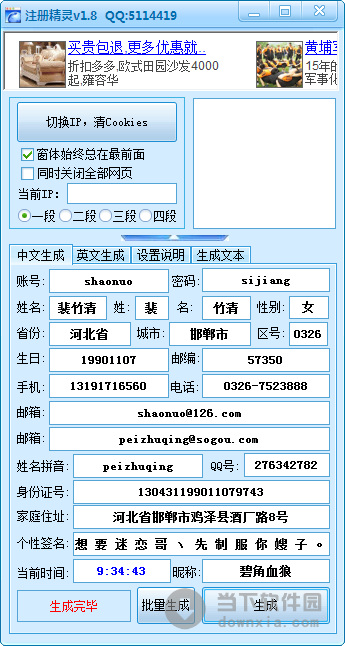 软件名称:快速注册精灵|注册精灵 V2.4 绿色免费版 软件大小:1173KB 软件语言:简体中文 软件类别:国产软件/免费软件/浏览辅助 运行环境:Win2003, WinXP, Win2000, Vista, Win7 软件简介: 快速注册精灵是一款换ip 清cookies以及资料生成等软件,支持win7,换多段ip,生成各种资料,及英文资料,批量生成,身份证号,住址等。注册手的好伴侣。 快速注册精灵|注册精灵 V2.4 绿色免费版 下载 快速注册精灵|注册精灵 V2.4 绿色免费版 迅雷下载 下载页面:http://www.downxia.com/downinfo/23095.html