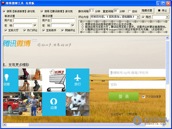软件名称:微博刷粉工具|维维微博工具 V1.1 免费版 软件大小:200KB 软件语言:简体中文 软件类别:国产软件/免费软件/浏览辅助 运行环境:Win2003, WinXP, Win2000, Vista, Win7 软件简介: 维维微博工具是一款方便实用的微博刷粉工具。他为用户提供7天的免费试用,试用后需要重新进行下载。前期速度可到每天200左右,后期每天180左右。 微博刷粉工具|维维微博工具 V1.1 免费版 下载 微博刷粉工具|维维微博工具 V1.1 免费版 迅雷下载 下载页面:http://www.downxia.com/downinfo/30768.html