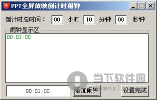 软件名称:ppt全屏放映计时闹钟|全屏放映计时闹钟 1.0 绿色免费版 软件大小:276KB 软件语言:简体中文 软件类别:国产软件/免费软件/开关定时 运行环境:Win2003, WinXP, Win2000, Vista, Win7 软件简介: ppt全屏放映计时闹钟是一个可爱的小闹钟,当全屏放映ppt时,它可以自动进入倒计时,退出全屏倒计时暂停,帮助ppt放映计时. ppt全屏放映计时闹钟|全屏放映计时闹钟 1.0 绿色免费版 下载 ppt全屏放映计时闹钟|全屏放映计时闹钟 1.0 绿色免费版 迅雷下载 下载页面:http://www.downxia.com/downinfo/30966.html