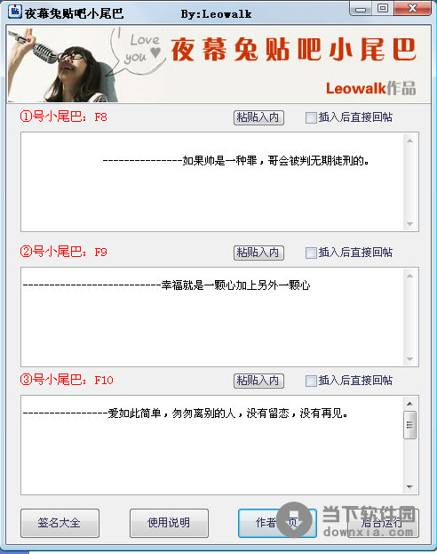 软件名称:夜幕兔贴吧小尾巴|夜幕兔贴吧小尾巴 V2.0 绿色免费版 软件大小:242KB 软件语言:简体中文 软件类别:国产软件/免费软件/浏览辅助 运行环境:Win2003, WinXP, Win2000, Vista, Win7 软件简介: 夜幕兔贴吧小尾巴是一款为百度贴吧设置的小尾巴工具。用户可以通过快捷键f8、f9、f10可以快速方便的设置,支持立即回复,而且完全绿色免费,喜欢的话就赶紧下载吧。 夜幕兔贴吧小尾巴|夜幕兔贴吧小尾巴 V2.0 绿色免费版 下载 夜幕兔贴吧小尾巴|夜幕兔贴吧小尾巴 V2.0 绿色免费版 迅雷下载 下载页面:http://www.downxia.com/downinfo/31015.html