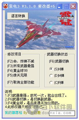 软件名称:雷电3修改器|雷电3修改器 V3.1.0 绿色版 软件大小:3296KB 软件语言:简体中文 软件类别:游戏视频/免费软件/游戏工具 运行环境:Win2003, WinXP, Win2000, Vista, Win7 软件简介: 雷电3修改器是一款集合了三款雷电3修改工具的软件,可以修改无限命、无限炸弹、最大护甲能量和导弹持续。 雷电3修改器|雷电3修改器 V3.1.0 绿色版 下载 雷电3修改器|雷电3修改器 V3.1.0 绿色版 迅雷下载 下载页面:http://www.downxia.com/downinfo/31014.html