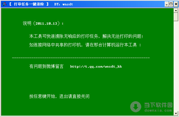 软件名称:打印任务一键清除|打印任务一键清除 2011.10.13 绿色免费版 软件大小:33KB 软件语言:简体中文 软件类别:国产软件/免费软件/卸载清除 运行环境:Win2003, WinXP, Win2000, Vista, Win7 软件简介: 打印任务一键清除是一款可以帮助用户快速清除无响应打印任务的工具,该工具很好的解决了无法打印的问题,用户只需将工具安装在连接了共享打印机的计算机即可。 打印任务一键清除|打印任务一键清除 2011.10.13 绿色免费版 下载 打印任务一键清除|打印任务一键清除 2011.10.13 绿色免费版 迅雷下载 下载页面:http://www.downxia.com/downinfo/31130.html