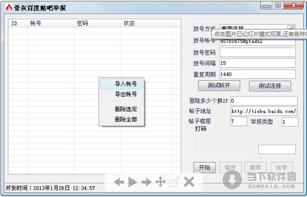 软件名称:骨灰百度贴吧举报|骨灰百度贴吧举报 1.0 绿色免费版 软件大小:1413KB 软件语言:简体中文 软件类别:国产软件/免费软件/浏览辅助 运行环境:Win2003, WinXP, Win2000, Vista, Win7 软件简介: 骨灰百度贴吧举报的作用就是导入一群百度帐号然后对着某个百度贴吧里面的某个帖子的某个楼层进行举报。 骨灰百度贴吧举报|骨灰百度贴吧举报 1.0 绿色免费版 下载 骨灰百度贴吧举报|骨灰百度贴吧举报 1.0 绿色免费版 迅雷下载 下载页面:http://www.downxia.com/downinfo/31134.html