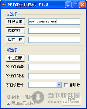 软件名称:PPT课件打包机|PPT课件打包机 V2.6 绿色免费版 软件大小:4338KB 软件语言:简体中文 软件类别:国产软件/免费软件/杂类工具 运行环境:Win2003, WinXP, Win2000, Vista, Win7 软件简介: PPT课件打包机是一款能够帮助用户将 ppt 课件(可包含图片、音频、视频等文件)打包成 exe 可执行单文件的工具,而且用户可以自定义打包后的文件图标、版权信息、课件描述等信息 PPT课件打包机|PPT课件打包机 V2.6 绿色免费版 下载 PPT课件打包机|PPT课件打包机 V2.6 绿色免费版 迅雷下载 下载页面:http://www.downxia.com/downinfo/36419.html