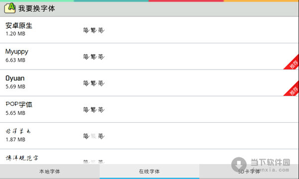 软件名称:安卓手机换字体|我要换字体 for Android V2.0.1 安卓版 软件大小:4587KB 软件语言:简体中文 软件类别:手机软件/免费软件/Android 运行环境:Android 软件简介: 我要换字体for Andriod是一款安卓手机换字体工具。该工具拥有强大的在线字体和内存卡字体的字体查看器和安装器。适合android2.1以上的用户使用。 安卓手机换字体|我要换字体 for Android V2.0.1 安卓版 下载 安卓手机换字体|我要换字体 for Android V2.0.1 安卓版 迅雷下载 下载页面:http://www.downxia.com/downinfo/22855.html
