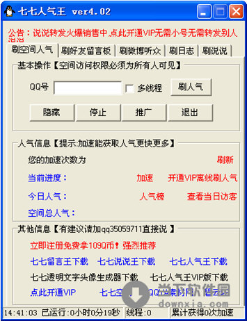 软件名称:七七人气王下载|七七人气王 V4.17 官方最新版 软件大小:726KB 软件语言:简体中文 软件类别:国产软件/免费软件/QQ 专区 运行环境:Win2003, WinXP, Win2000, Vista, Win7 软件简介: 七七人气王是一款目前最简单、最好用的一款纯绿色QQ空间刷人气软件!现在有一款绿色好用的七七人气王软件,有了它,刷人气再也不用求人了,再也不用花钱给别人刷人气了。 七七人气王下载|七七人气王 V4.17 官方最新版 下载 七七人气王下载|七七人气王 V4.17 官方最新版 迅雷下载 下载页面:http://www.downxia.com/downinfo/23557.html