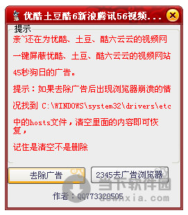 软件名称:视频网站广 告屏蔽软件|十二路视频广 告屏蔽器 V1.0 绿色免费版 软件大小:2268KB 软件语言:简体中文 软件类别:国产软件/免费软件/媒体其它 运行环境:Win2003, WinXP, Win2000, Vista, Win7 软件简介: 十二路视频广 告屏蔽器是一款纯绿色免安装的软件,它的功能就是帮助用户将优酷、土豆、酷六等视频网站的广 告进行屏蔽,给用户带来一个清爽的影视欣赏体验。 视频网站广 告屏蔽软件|十二路视频广 告屏蔽器 V1.0 绿色免费版 下载 视频网站广 告屏蔽软件|十二路视频广 告屏蔽器 V1.0 绿色免费版 迅雷下载 下载页面:http://www.downxia.com/downinfo/38625.html