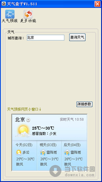 软件名称:中国天气小工具|天气盒子 V1.511 绿色免费版 软件大小:1606KB 软件语言:简体中文 软件类别:国产软件/免费软件/桌面工具 运行环境:Win2003, WinXP, Win2000, Vista, Win7 软件简介: 天气盒子是一款可以让用户快速查询全国各地天气情况的工具. 中国天气小工具|天气盒子 V1.511 绿色免费版 下载 中国天气小工具|天气盒子 V1.511 绿色免费版 迅雷下载 下载页面:http://www.downxia.com/downinfo/39005.html