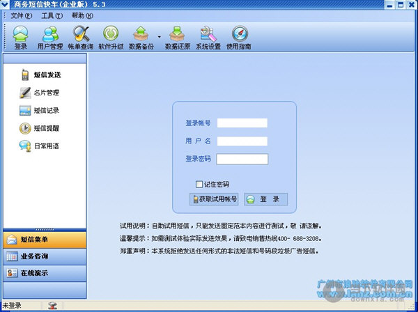 软件名称:浪驰商务短信快车|商务短信快车 V6.0 官方最新版 软件大小:3437KB 软件语言:简体中文 软件类别:国产软件/免费软件/信息管理 运行环境:Win2003, WinXP, Win2000, Vista, Win7 软件简介: 商务短信快车是一款基于互联网和移动通信网为平台的面向企事业单位定制开发短信发送软件. 浪驰商务短信快车|商务短信快车 V6.0 官方最新版 下载 浪驰商务短信快车|商务短信快车 V6.0 官方最新版 迅雷下载 下载页面:http://www.downxia.com/downinfo/39133.html