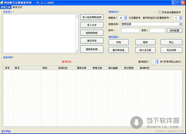 软件名称:网易账号点数批量查询|网易账号点数批量查询 V1.3.1.0000 绿色版 软件大小:375KB 软件语言:简体中文 软件类别:国产软件/试用软件/杂类工具 运行环境:Win2003, WinXP, Win2000, Vista, Win7 软件简介: 网易账号点数批量查询是一款能够批量查询网易账号点数的实用小工具,使用这款工具可以查询账号的通用点数、寄售点数、倩女幽魂点卡、梦幻西游点卡. 网易账号点数批量查询|网易账号点数批量查询 V1.3.1.0000 绿色版 下载 网易账号点数批量查询|网易账号点数批量查询 V1.3.1.0000 绿色版 迅雷下载 下载页面:http://www.downxia.com/downinfo/39152.html