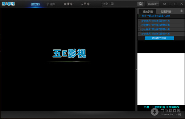 软件名称:五E影视|五E影视 V8.0 官方版 软件大小:8539KB 软件语言:简体中文 软件类别:媒体播放/免费软件/媒体播放 运行环境:Win2003, WinXP, Win2000, Vista, Win7 软件简介: 五E影视是一款能够在线播放电影的播放器,这款播放器采用P2P点播方式,播放速度极快,无需任何等待。这款播放器具有完全免费、内容每天更新、画面高清等特点。 五E影视|五E影视 V8.0 官方版 下载 五E影视|五E影视 V8.0 官方版 迅雷下载 下载页面:http://www.downxia.com/downinfo/38819.html