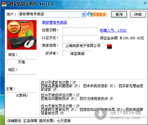 软件名称:淘宝信用查询工具|淘宝信用分析仪 V1.0 绿色版 软件大小:846KB 软件语言:简体中文 软件类别:国产软件/免费软件/行业软件 运行环境:Win2003, WinXP, Win2000, Vista, Win7 软件简介: 淘宝信用分析仪是一款能够查询卖家和买家信用度的软件。 淘宝信用查询工具|淘宝信用分析仪 V1.0 绿色版 下载 淘宝信用查询工具|淘宝信用分析仪 V1.0 绿色版 迅雷下载 下载页面:http://www.downxia.com/downinfo/39460.html