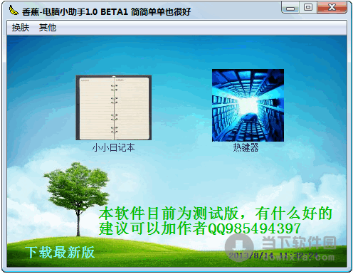 软件名称:香蕉电脑小助手|香蕉电脑小助手 1.0 绿色免费版 软件大小:1300KB 软件语言:简体中文 软件类别:国产软件/免费软件/系统其它 运行环境:Win2003, WinXP, Win2000, Vista, Win7 软件简介: 香蕉电脑小助手是一款非常实用的电脑工具,由于刚开始发布,功能还很有限,现在支持日记编辑功能,换肤功能,热剑气功能. 香蕉电脑小助手|香蕉电脑小助手 1.0 绿色免费版 下载 香蕉电脑小助手|香蕉电脑小助手 1.0 绿色免费版 迅雷下载 下载页面:http://www.downxia.com/downinfo/39466.html