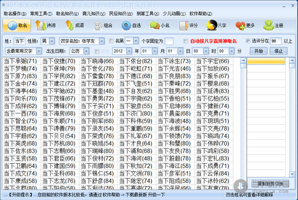 软件名称:周易起名软件|周易取名 V8.3.1.930 官方版 软件大小:8297KB 软件语言:简体中文 软件类别:国产软件/免费软件/杂类工具 运行环境:Win2003, WinXP, Win2000, Vista, Win7 软件简介: 周易取名是一款起名软件,用户使用这款周易起名软件可以一键得出大量的名字。 周易起名软件|周易取名 V8.3.1.930 官方版 下载 周易起名软件|周易取名 V8.3.1.930 官方版 迅雷下载 下载页面:http://www.downxia.com/downinfo/39517.html