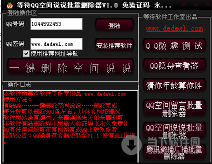 软件名称:空间说说批量删除器|等待QQ空间说说批量删除器 V1.0 绿色免费版 软件大小:486KB 软件语言:简体中文 软件类别:国产软件/免费软件/QQ 专区 运行环境:Win2003, WinXP, Win2000, Vista, Win7 软件简介: 等待QQ空间说说批量删除器是一款简单、小巧的QQ空间说说快速批量删除工具,玩家可以通过这款空间说说批量删除器每分钟删除300条左的说说,让您的QQ空间更加简洁。 空间说说批量删除器|等待QQ空间说说批量删除器 V1.0 绿色免费版 下载 空间说说批量删除器|等待QQ空间说说批量删除器 V1.0 绿色免费版 迅雷下载 下载页面:http://www.downxia.com/downinfo/39525.html
