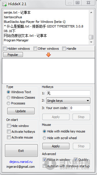 软件名称:HiddeX(一键隐藏任意窗口) V2.1 免费版 软件大小:512KB 软件语言:英文 软件类别:国外软件/免费软件/系统其它 运行环境:Win2003, WinXP, Win2000, Vista, Win7 软件简介: HiddeX是一款能够一键隐藏任意窗口的软件。该软件支持一键静音,可以隐藏任务栏上的程序按钮,通知区的图标等等。 HiddeX(一键隐藏任意窗口) V2.1 免费版 下载 HiddeX(一键隐藏任意窗口) V2.1 免费版 迅雷下载 下载页面:http://www.downxia.com/downinfo/39537.html
