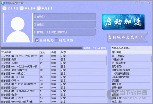 软件名称:云游网游加速器|云游网游加速器 1.0 绿色免费版 软件大小:653KB 软件语言:简体中文 软件类别:国产软件/免费软件/网络加速 运行环境:Win2003, WinXP, Win2000, Vista, Win7 软件简介: 云游网游加速器是一款免费的网游加速软件,专门针对网络游戏,解决游戏中延时、顿卡以及无法顺利进入游戏等现象。 云游网游加速器|云游网游加速器 1.0 绿色免费版 下载 云游网游加速器|云游网游加速器 1.0 绿色免费版 迅雷下载 下载页面:http://www.downxia.com/downinfo/40883.html