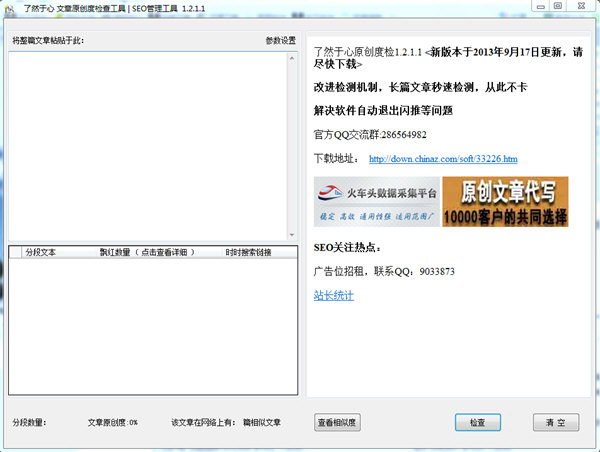 软件名称:了然于心文章原创度检测工具|了然于心文章原创度检测工具 V1.2.1.0 绿色版 软件大小:64KB 软件语言:简体中文 软件类别:国产软件/免费软件/行业软件 运行环境:Win2003, WinXP, Win2000, Vista, Win7 软件简介: 了然于心文章原创度检测工具是为SEO管理人员倾心打造的一款辅助工具,使用这款辅助工具可查询手下工作人员所写文章的原创程度。 了然于心文章原创度检测工具|了然于心文章原创度检测工具 V1.2.1.0 绿色版 下载 了然于心文章原创度检测工具|了然于心文章原创度检测工具 V1.2.1.0 绿色版 迅雷下载 下载页面:http://www.downxia.com/downinfo/40888.html