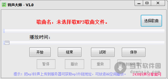 铃 声大师是一款非常简易的MP3音乐剪辑工具,使用这款工具对音乐剪辑后可直接用来当做手机铃 声,还可直接上传至服务器得到链接地址当做QQ空间背景音乐。