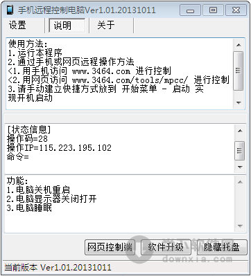 软件名称:手机控制电脑软件|手机远程控制电脑软件 V1.01 绿色免费版 软件大小:789KB 软件语言:简体中文 软件类别:国产软件/免费软件/远程监控 运行环境:Win2003, Win2000, Vista, Win7 软件简介: 手机远程控制电脑软件是一款方便易用的手机控制电脑软件。该软件支持手机远程关闭重启电脑,可以通过电脑浏览器或手机远程操作客户端电脑重启、关机。 手机控制电脑软件|手机远程控制电脑软件 V1.01 绿色免费版 下载 手机控制电脑软件|手机远程控制电脑软件 V1.01 绿色免费版 迅雷下载 下载页面:http://www.downxia.com/downinfo/41516.html