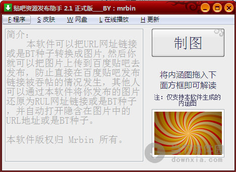 软件名称:贴吧资源发布助手|贴吧资源发布助手 V2.1 绿色免费版 软件大小:2078KB 软件语言:简体中文 软件类别:国产软件/免费软件/浏览辅助 运行环境:Win2003, WinXP, Win2000, Vista, Win7 软件简介: 贴吧资源发布助手是一款可以帮助用户把URL网址链接或是BT种子转换成图片的软件。 贴吧资源发布助手|贴吧资源发布助手 V2.1 绿色免费版 下载 贴吧资源发布助手|贴吧资源发布助手 V2.1 绿色免费版 迅雷下载 下载页面:http://www.downxia.com/downinfo/41522.html
