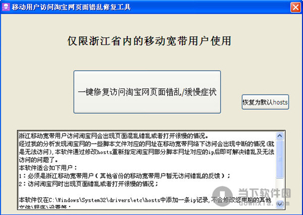 移动用户访问淘宝网页面错乱修复工具是为浙江省移动宽带部分用户打造的一款修复工具,使用这款工具可以修复部分移动用户打开淘宝页面出错的问题。