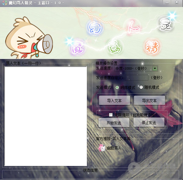 软件名称:魔幻骂人精灵|魔幻骂人精灵 V1.0 绿色免费版 软件大小:2365KB 软件语言:简体中文 软件类别:国产软件/免费软件/杂类工具 运行环境:Win2003, WinXP, Win2000, Vista, Win7 软件简介: 魔幻骂人精灵是一款能够自动骂人的软件,这款软件可批量导入骂人文本、刷屏骂人,是一款QQ、YY以及其他场合的骂人利器。 魔幻骂人精灵|魔幻骂人精灵 V1.0 绿色免费版 下载 魔幻骂人精灵|魔幻骂人精灵 V1.0 绿色免费版 迅雷下载 下载页面:http://www.downxia.com/downinfo/42030.html