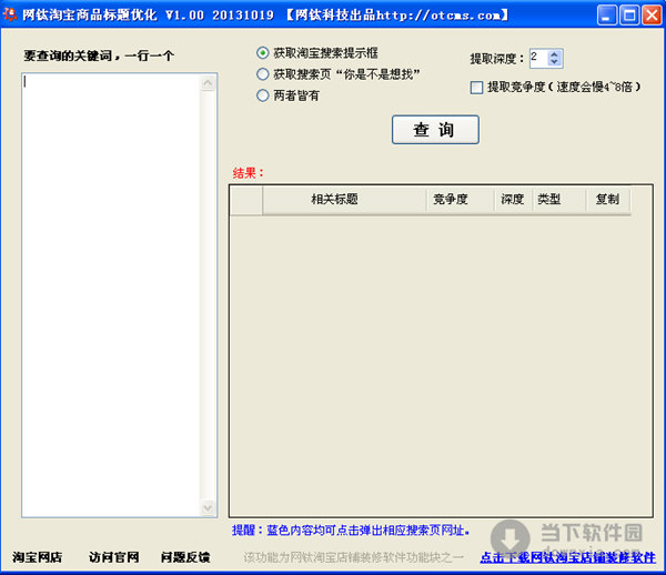 软件名称:淘宝关键词优化工具|网钛淘宝商品标题优化 V1.00 绿色免费版 软件大小:134KB 软件语言:简体中文 软件类别:国产软件/免费软件/行业软件 运行环境:Win2003, WinXP, Win2000, Vista, Win7 软件简介: 网钛淘宝商品标题优化是淘宝卖家必不可少的一款淘宝关键词优化工具,使用这款工具可帮助卖家找出更适合宝贝的关键词,帮助卖家提升销量和流量。 淘宝关键词优化工具|网钛淘宝商品标题优化 V1.00 绿色免费版 下载 淘宝关键词优化工具|网钛淘宝商品标题优化 V1.00 绿色免费版 迅雷下载 下载页面:http://www.downxia.com/downinfo/42036.html