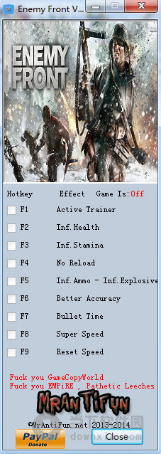 敌军前线八项属性修改器是该款同名二战题材射击类游戏——《敌军前线》的作 弊工具。该款敌军前线辅助器可进行无限生命、无限体力、无限弹药、超级速度、超级精准等8项游戏操作辅助,帮助你更轻松的进行游戏,顺利过关。