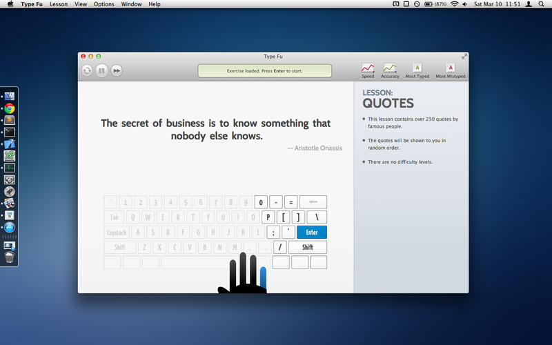 TypeFu mac版是一款苹果电脑上用于盲打练习软件,初学英语的人都需要经历打字练习,而这款Type Fu for mac难度循环渐进,不同形式的任务安排合理,非常适合小孩、盲人和初学者使用。